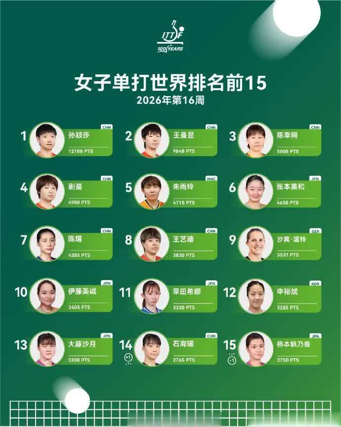 国际乒联2026年第15周世界排名,是以2026WTT常规挑战赛太原站、WTT支线赛卡帕多西亚站Ⅱ为时间节点。中国女乒的主力球员没有参赛,她们的世界排名没有变化。在女子单打前10当中有6名中国选手,其中,员孙颖莎、王曼昱、陈幸同、蒯曼包揽前四,陈熠排在第七,王艺迪排在第八。